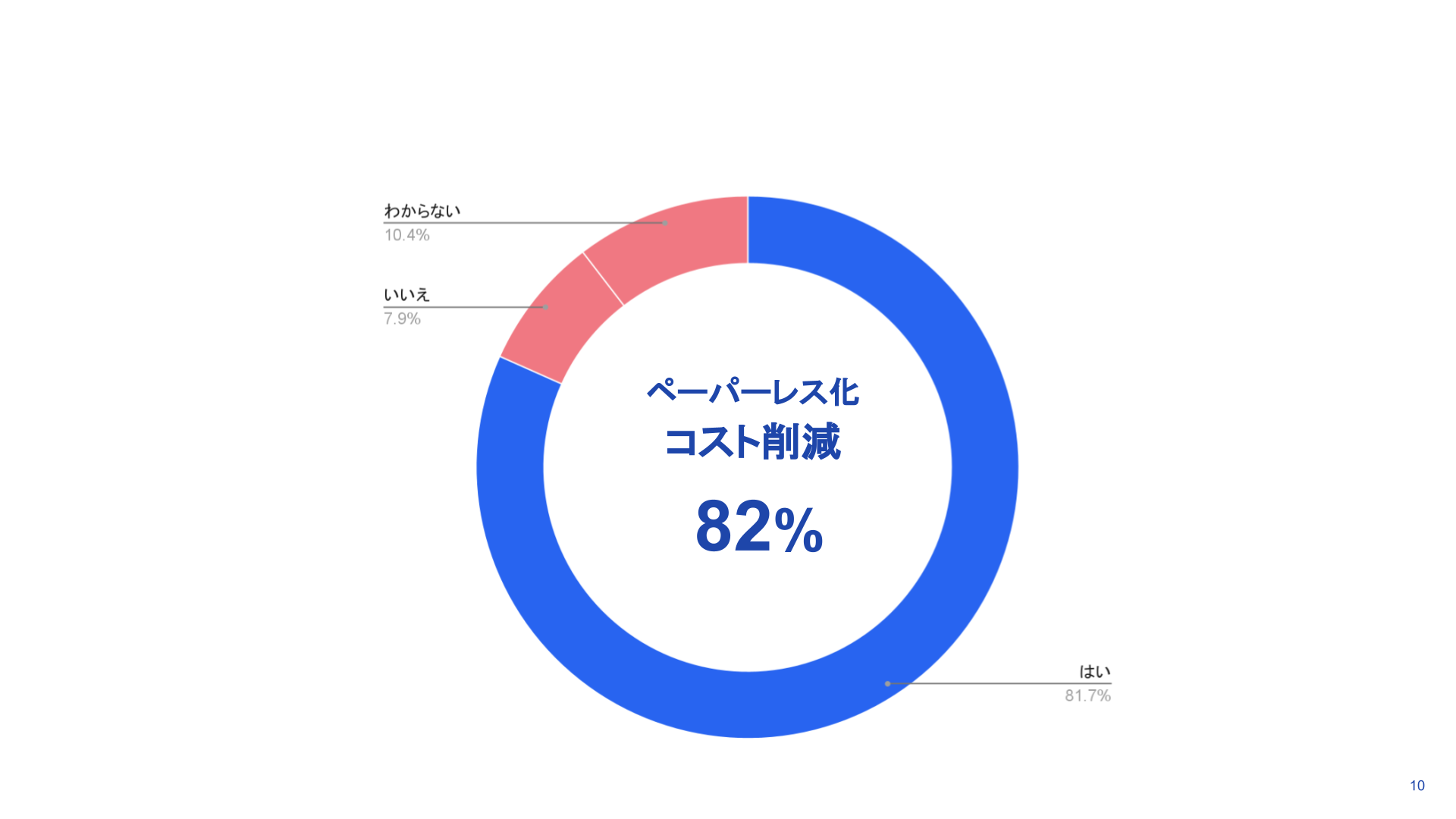 ペーパーレス化が「とても進ん でいる」「進んでいる」と回答した方たちは、「効率化を実感している層」が79%、「コスト減を実感している層」が82%とそれぞれ8割前後もメリットを実感しており、ペーパーレス化が浸透してしまえば、メリットを実感できる方たちが大半であることがわかりました。