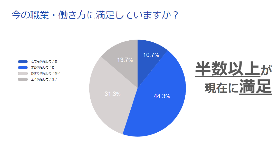 10.7%が「とても満足している」44.3%が「まあ満足している」と回答し、全体の半数以上が現在の職業・働き方に満足しているという結果になりました。