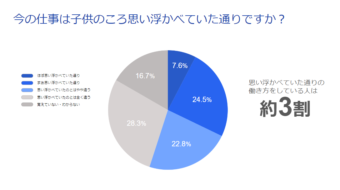子供の頃思い浮かべていた通りの職業・働き方をしているかという問いに対し、「ほぼ思い浮かべた通り」と回答したのが7.6%、「まあ思い浮かべた通り」と回答したのが24.5%という結果になりました。今、子供の頃思い浮かべた通りの職業・働き方をしている人は全体の約3割にとどまりました。