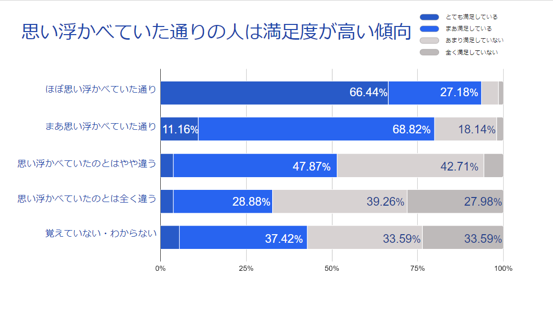 今の職業・働き方への満足度と今子供の頃思い浮かべていた通りの職業・働き方かどうかをかけ合わせると、「思い浮かべていた通り」と回答している人ほど今の満足度は高いことがわかりました。