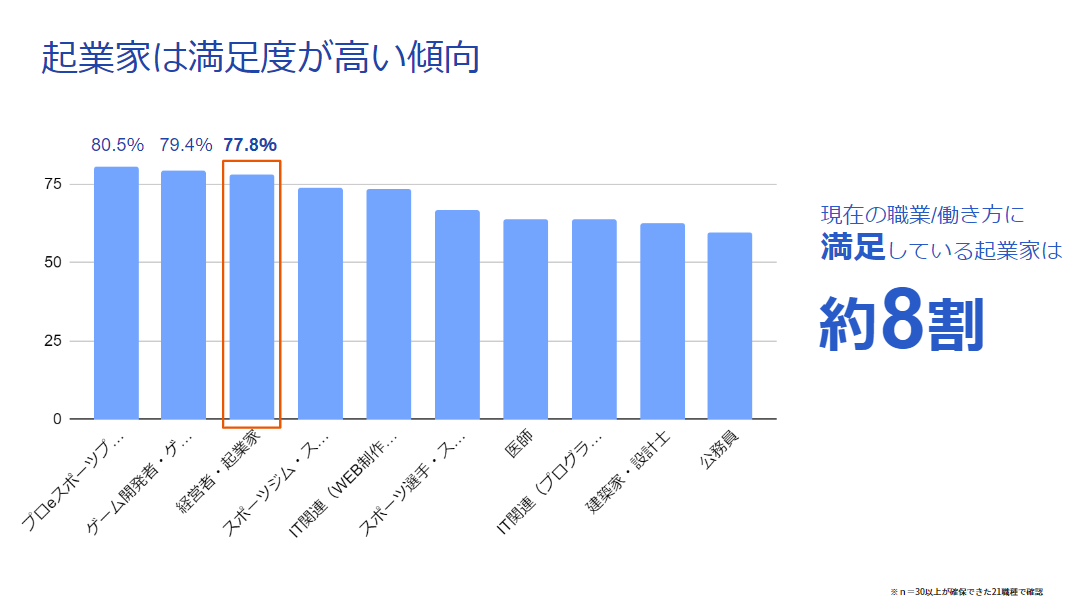 ・「今の仕事に満足しているか」という問いに対して「とても満足している、まあ満足している」と回答した起業家は77.8%で全体の3位、起業家になった人の満足度は高い傾向にあることがわかりました