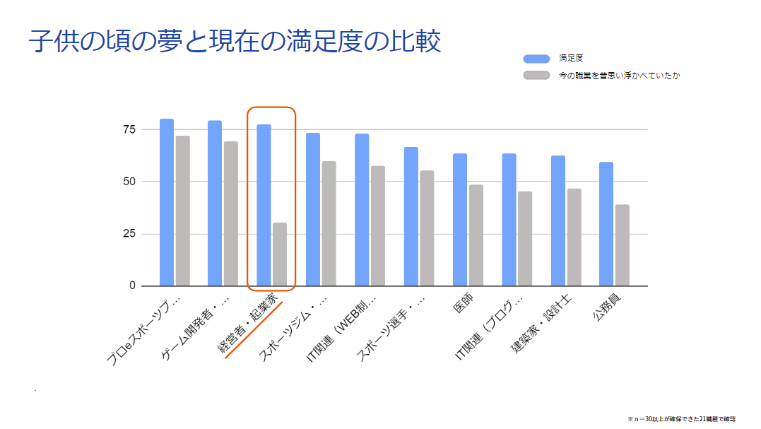 全年代を合計したランキングにおいては、起業家と回答した人は1.84%で、①の「子どもの頃なりたかった職業」の33位から21ポイント高い12位まで上昇しました。