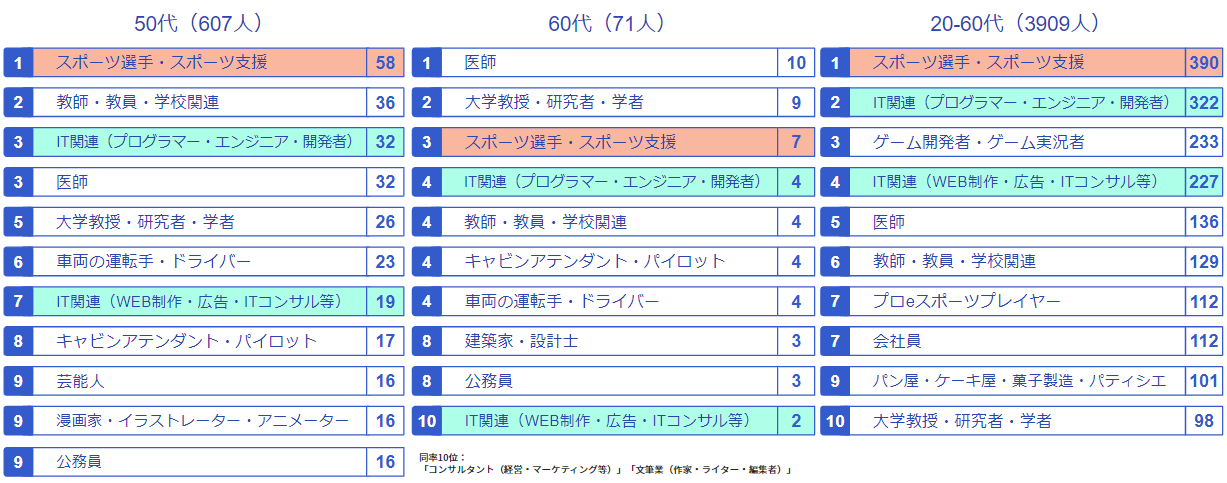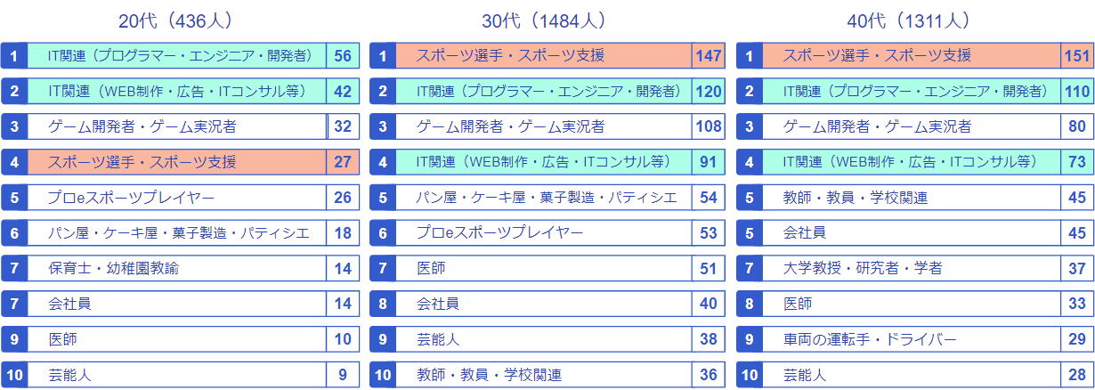 IT関連(プログラマー・エンジニア・開発者)は年代が若くなるにつれて人気が高くなっていることがわかりました。また、30代から40代においてはいずれもスポーツ選手・スポーツ支援が最も人気が高い結果となりました。