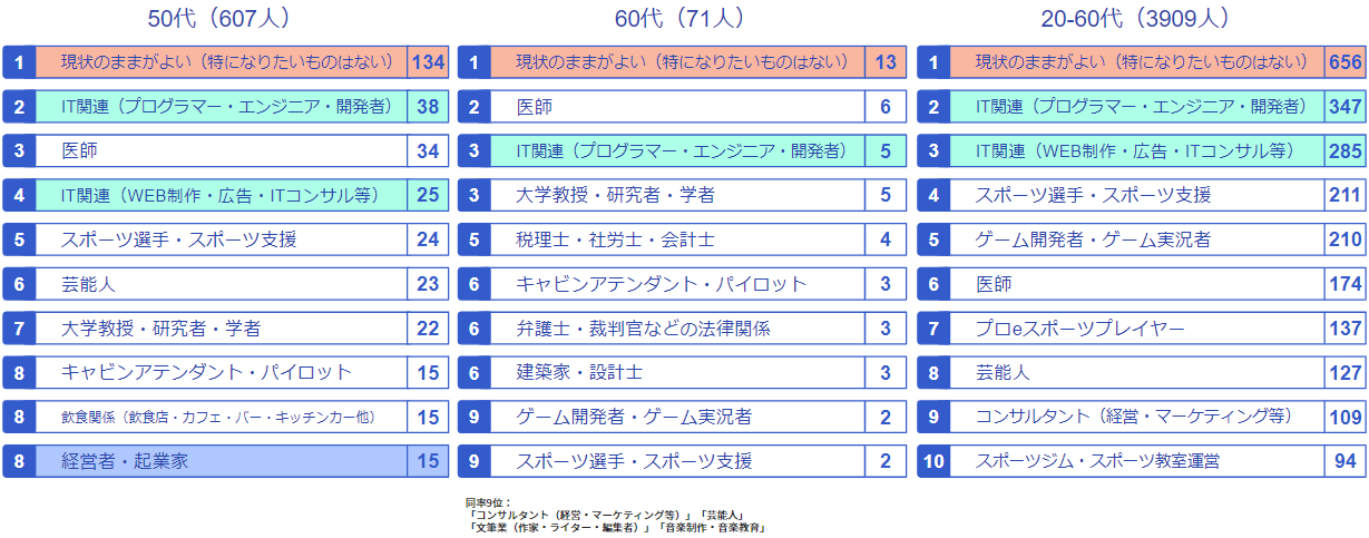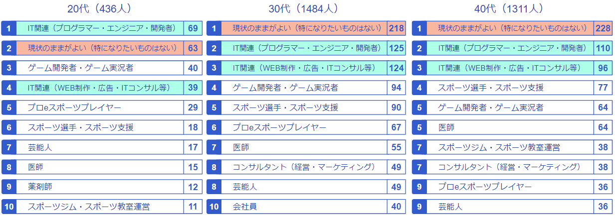 20代以外の年代で「現状のままがよい(特になりたいものはない)」が1位でした。20代はIT関連(プログラマー・エンジニア・開発者)が最も人気という結果となりました。
