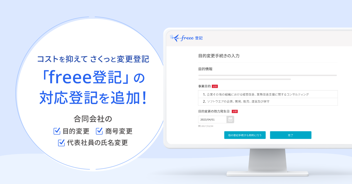 freee株式会社(本社:東京都品川区、CEO:佐々木大輔、以下「freee」)は変更登記書類をオンラインで作成できる「freee登記」において、新たに合同会社の「商号変更」「目的変更」「代表社員および職務執行者の氏名変更」の登記書類作成に対応しました。