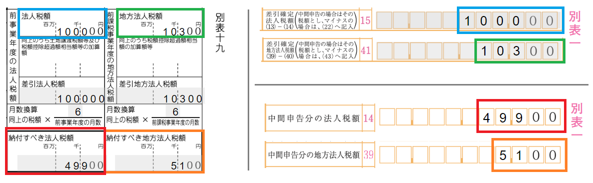 (右上:前年度確定申告、左:今年度予定申告、右下:今年度確定申告)