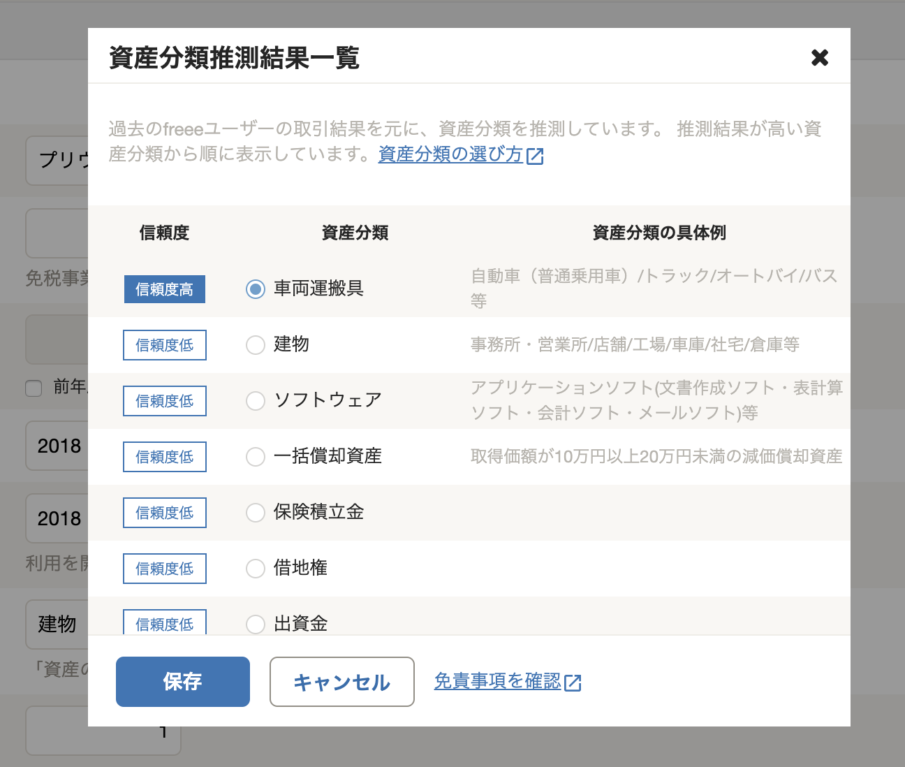 例:プリウスという資産名称を入力すると「車両運搬具」を推測