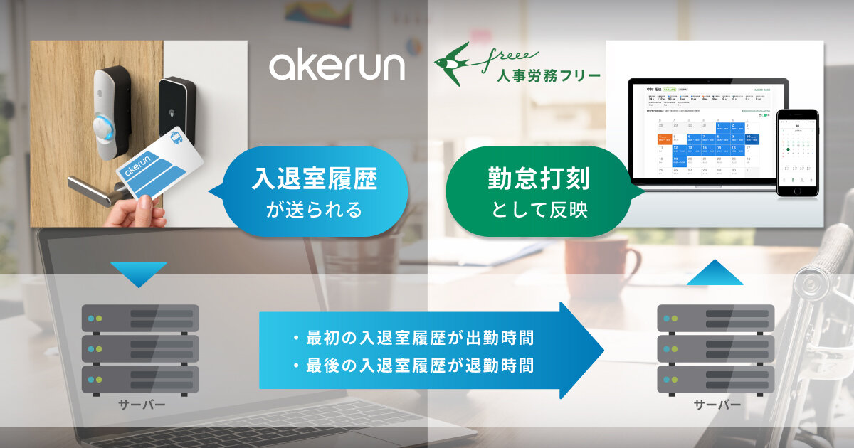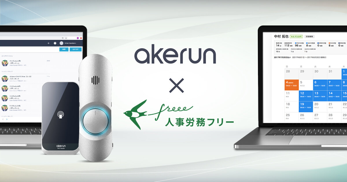 freee株式会社(本社:東京都品川区、CEO:佐々木大輔、以下「freee」)は、株式会社フォトシンス(本社:東京都港区、代表取締役社長 : 河瀬航大、以下「フォトシンス」)が提供する「Akerun入退室管理システム」とクラウド型人事労務ソフト「人事労務freee」(以下人事労務freee)との連携サービスを2019年8月20日(火)より提供開始することをお知らせいたします。