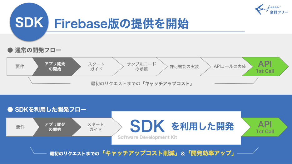 今回リリースしたSDKを利用することで、Firebaseの機能と会計freeeを連携することが可能となり、Webアプリやモバイルアプリの素早い開発および開発工数の削減が期待できます。