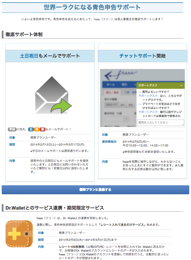 新サポートサービスは、(1)チャットサポートと土日祝のメール対応、(2)レシート郵送サービス、(3)記帳後の青色申告代行サービス、(4)e-TAX正式対応、および電子申告・確定申告書B対応(確定申告書Bは申告期間中の対応完了見込み)の4つ。