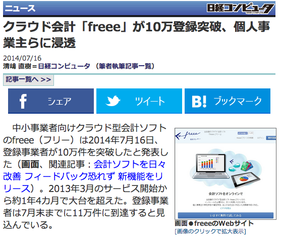 中小事業者向けクラウド型会計ソフトのfreee(フリー)は2014年7月16日、登録事業者が10万件を突破したと発表した(画面、関連記事:会計ソフトを日々改善 フィードバック恐れず 新機能をリリース)。2013年3月のサービス開始から約1年4カ月で大台を超えた。登録事業者は7月末までに11万件に到達すると見込んでいる。
