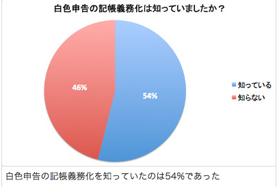 調査結果によると、平成26年度からの白色申告の記帳義務化を知っていたかの質問では、知っていたのは約半数の54%となった。