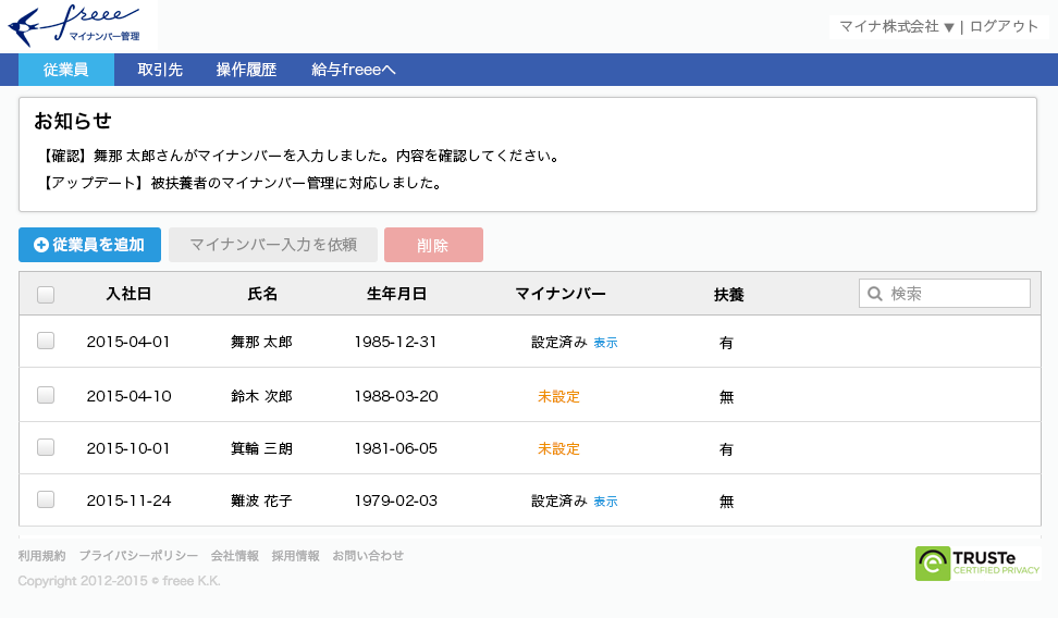 - 管理者が従業員のマイナンバーをマイナンバー管理 freee に入力できます。更に従業員がスマートフォンから自身のマイナンバーの入力ならびに本人確認書類をアップロードできる機能を今後公開予定です。