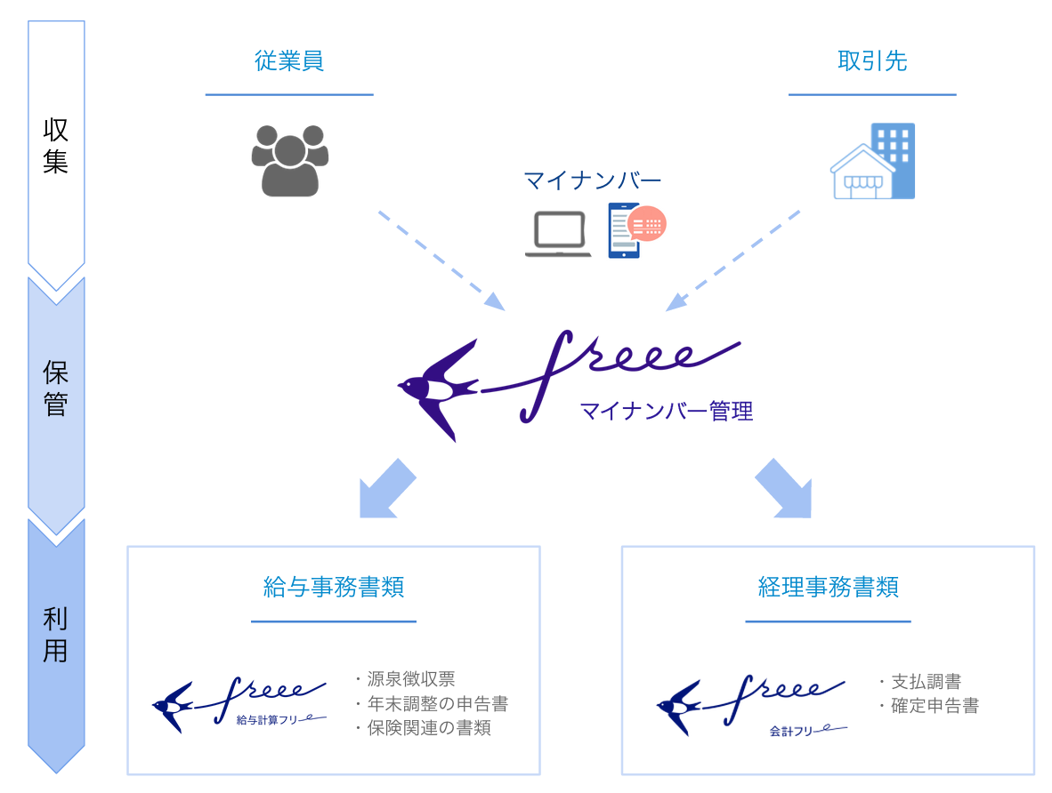 マイナンバー管理 freeeでは、マイナンバーの収集から保管までがクラウド上で完結するので、安全にマイナンバーを管理できます。更に freee が提供する給与計算・会計サービスとも連携しますので(※1)、マイナンバーの利用まで含めた一連の業務がクラウド上で完結し、マイナンバー管理にかかる手間を最小限に抑えることができます。