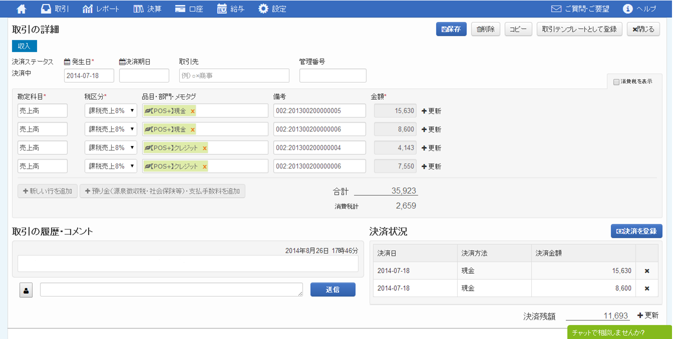・現金/クレジットカード/その他決済(商品券、電子マネーなど)の売上高