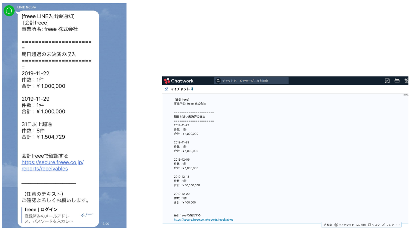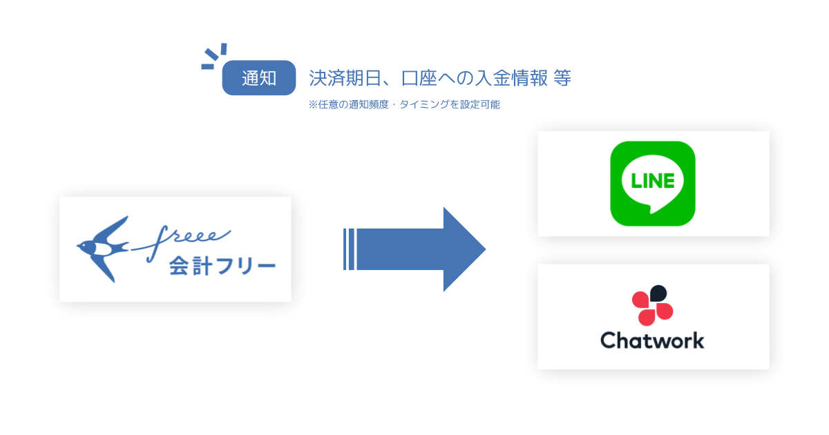 会計freeeとコミュニケーションツールのメッセージ機能が連携することで、入出金や取引の期限に関する通知が届き、支払い漏れの防止・資金状況の定期的な確認作業を省略することが可能となります。また、普段業務で利用しているコミュニケーションツールに通知を集約することができます。