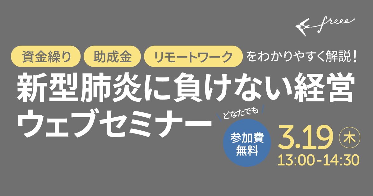 freeeは、3月19日(木)13:00から、新型コロナウイルス対策に関連する助成金などを詳しく解説するオンライン上のセミナーを開催します。