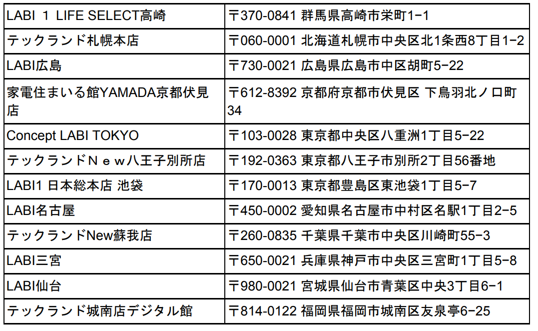 ■freeeサービスカウンターの設置店舗(全国12店舗)