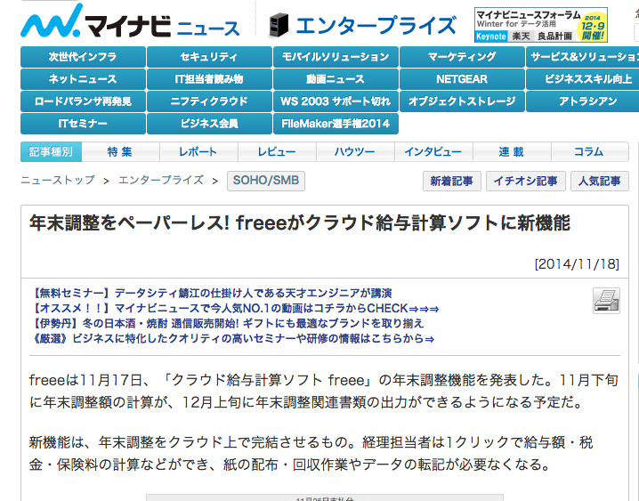 『マイナビニュース』などのメディアに掲載:年末調整をペーパーレス! freeeがクラウド給与計算ソフトに新機能